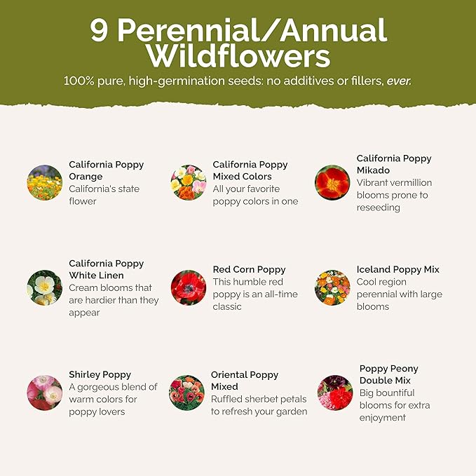 - 100% Pure, Non-GMO Seeds - No fillers, favorites only! Includes 8 easy-to-grow species: California Poppy Orange, California Poppy Mixed Colors, California Poppy Mikado, California Poppy White Linen, Red Corn Poppy, Iceland Poppy, Red Poppy Shirley Mix, Oriental Poppy