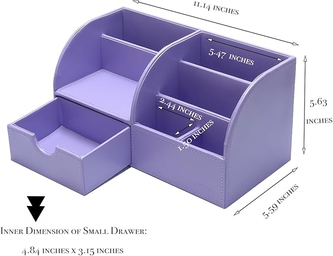 - Synthetic Faux Leather and Space Saving: Made of high density board and selected faux leather, with solid interior construction, to withstand the wear and tear of everyday use. Easy to clean, you could quickly wipe them with a damp cloth to remove any dust. At 11.22" wide 5.7" High and 5.7" deep, it fits easily in the desk. Say goodbye to cheap mess desk organizer, invest in this elegant desk organizer that is built to last, keep your workspace organized for years to come