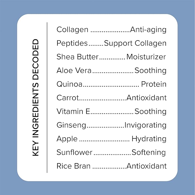 - NOURISHING + HYDRATING – With age our skin loses elasticity & moisture, our Clinically-Tested, Dermatologist-Tested, & Allergy-Tested hydrating Collagen + Peptides formula visibly smooths the look of skin's rough texture, plumps overall skin tone, & replenishes essential moisture to visibly restore volume to areas prone to sagging, dark spots, & wrinkles. Nourish, hydrate, & plump your skin for a healthier, fuller, & younger appearance while also improving your skins elasticity all at once.