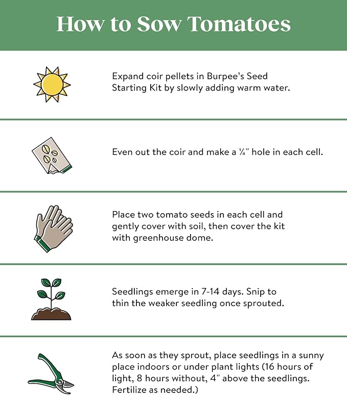- SEED STARTING TIP: Sow tomato seeds indoors 6-8 weeks before average last frost. Harden off young tomato plants by leaving them outdoors in their containers up to a week before transplanting, after all danger of frost.