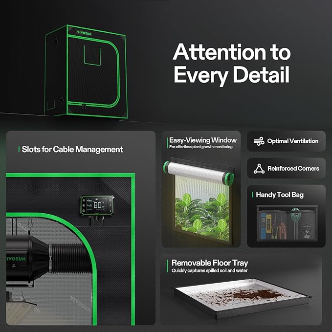 - Considerate Design & More Options: The plant grow tent offers plenty of openings for setting duct fans, lamps, electrical cords, etc.; The inner tool organizer is handy to put all your gardening tools based on your need; The tent is suitable for different places in your house, such as the domestic garage, balcony, laundry room, closet, and so on; We also provide various sizes of grow tents to meet your daily demands