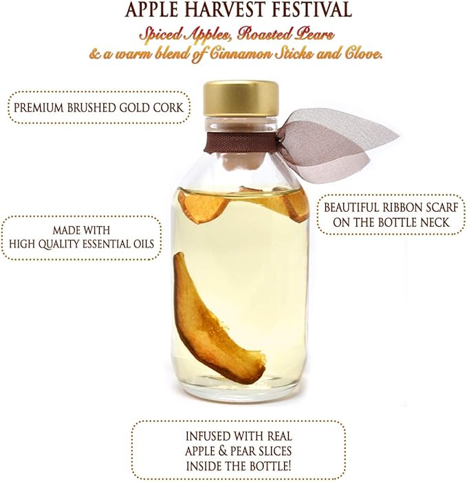 - APPLE HARVEST – cozy autumn notes of Red Apples, Roasted Pears, Apple Blossoms, and Sugarcane; in our Signature Apothecary Diffuser with a slender neck and chocolate brown ribbon accent, enhanced with real apple slices; complements warm coffee and deep brown spaces.