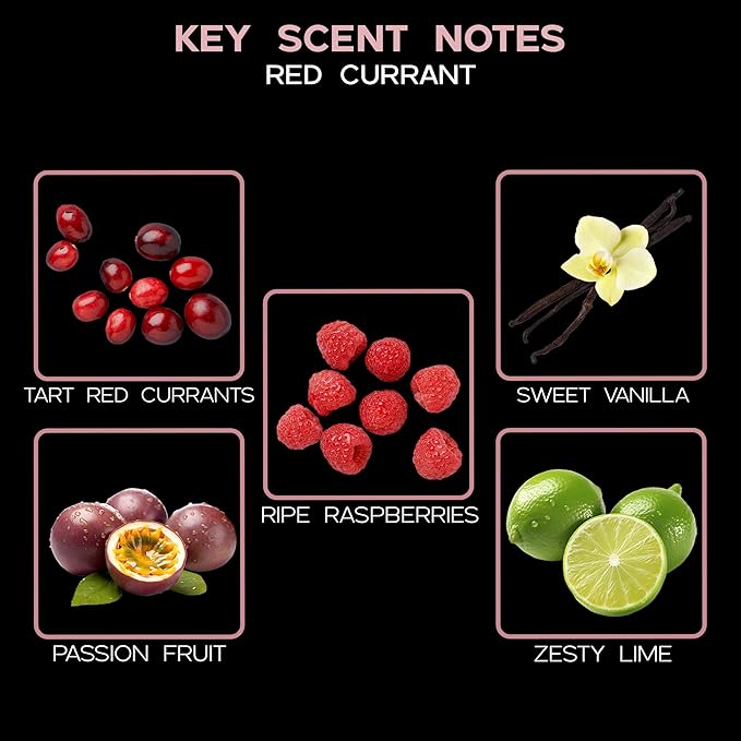 - RED CURRANT – captures the tart sweetness of Red Currants, mellowed by Vanilla and Raspberry; showcased in our Modern Striped Diffuser, a sleek frosted glass bottle etched with clean vertical stripes for a minimalist yet eye-catching look, topped with a slender neck and delicate deep wine ribbon accent for a refined, timeless look; brings a rich pop of color to burgundy, merlot, and cabernet-inspired décor