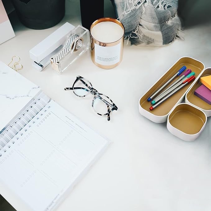 Three by Three Seattle 3 Piece Shallow Metal Organizer Tray Set for Storing Makeup, Stationery, Utensils, and More in Office Desk, Kitchen and Bathroom Drawers (1 Inch, Gold and White)