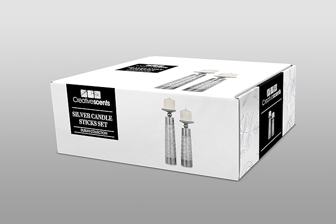Creative Scents Dublin Silver Decorative Candle Holder Set of 2 - Home Decor Pillar Candle Stand, Coffee Table Mantle Decor centerpieces for Fireplace, Living or Dining Room Table, Gift Boxed