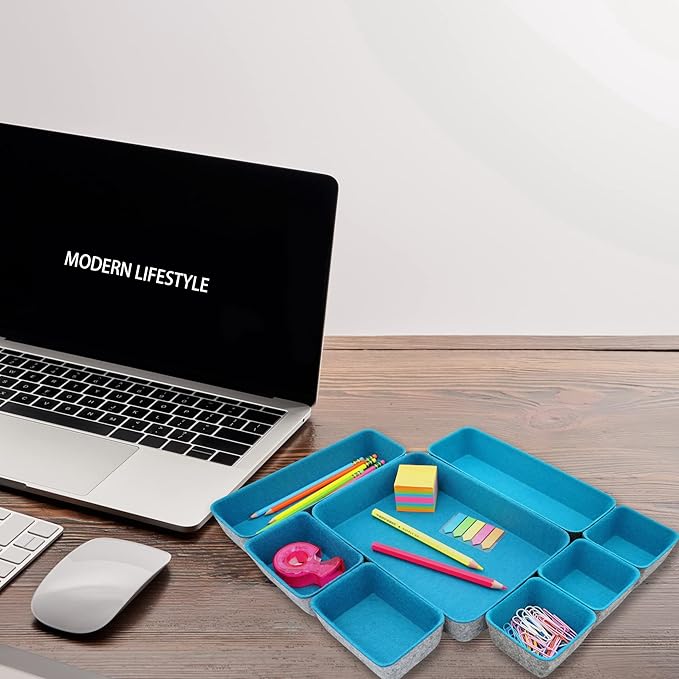 Welaxy desk drawer organizer tray felt storage bin for home office entryway catchall key holder makeup crafts pens decluttering 8-piece gift Solution (Turquoise)