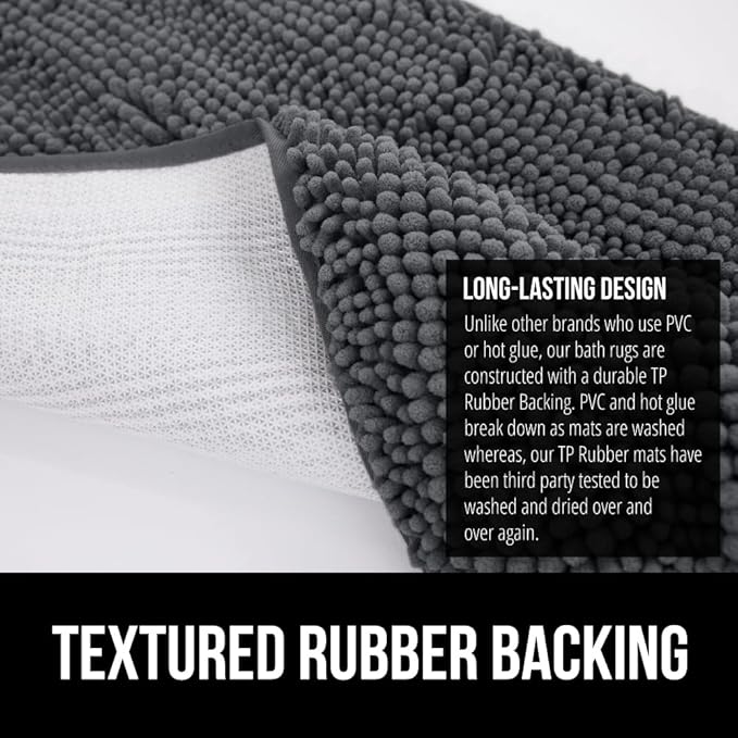- TEXTURED RUBBER BACKING: unlike other brands who use PVC or hot glue, our bath rugs are constructed with a durable TP Rubber Backing. PVC and hot glue break down as mats are washed whereas, our TP Rubber mats have been third party tested to be washed and dried over and over again for long lasting use