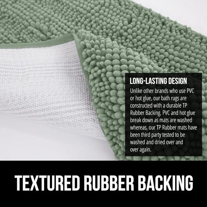 - TEXTURED RUBBER BACKING: unlike other brands who use PVC or hot glue, our bath rugs are constructed with a durable TP Rubber Backing. PVC and hot glue break down as mats are washed whereas, our TP Rubber mats have been third party tested to be washed and dried over and over again for long lasting use