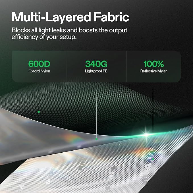 - Stand Sturdy & Extra-thick Materials: The indoor tent is supported with strong metal poles, top bars, and tool-free corner connectors to lock the structure securely in place; The top hanging bar can hold up to 250 lbs. each that can satisfy your different equip requirements; The premium 340 g high-density fabric is waterproof, tear-resistant and double-stitched for great light blockage, while the inside lining is designed with PE material and mylar walls that are safer for your plants