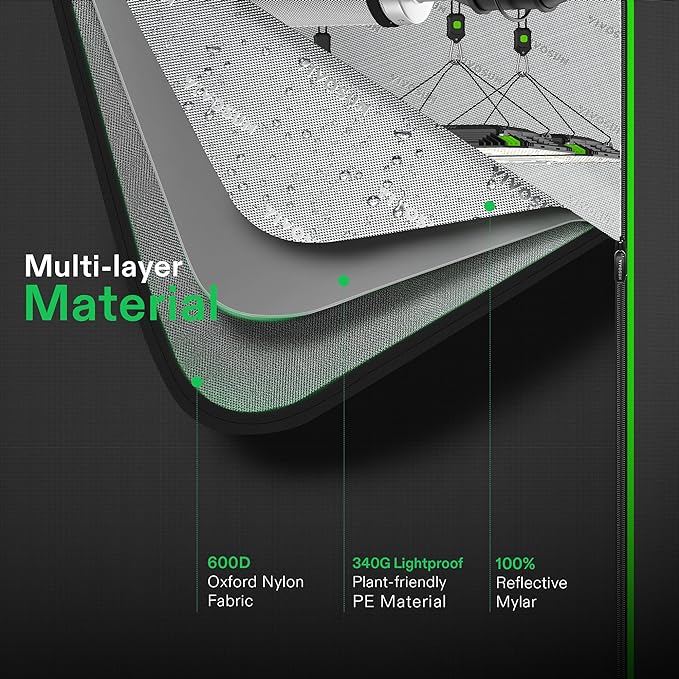 - Light-Proof Sealing: The 8 x 4 Roof Grow Tent prevents light from escaping; The interior 100% litchi reflective mylar lining increases the reflective efficiency by 1.5X compared to diamond mylar and it allows light to reach your plants from all angles