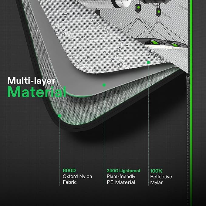 - Light-Proof Sealing: The 5 x 5 Roof Grow Tent prevents light from escaping; The interior 100% litchi reflective mylar lining increases the reflective efficiency by 1.5X compared to diamond mylar and it allows light to reach your plants from all angles