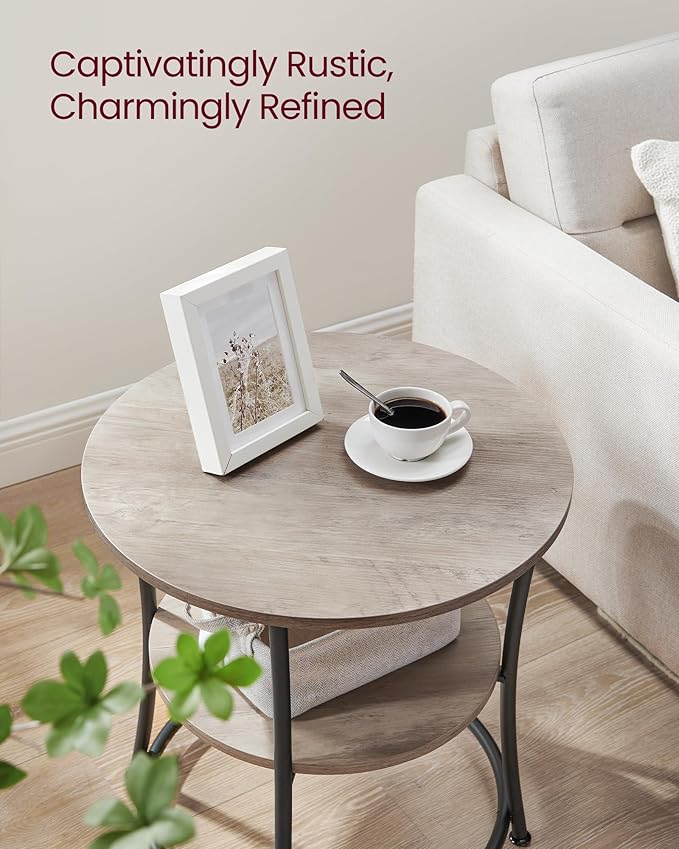 VASAGLE Side Table, 2-Tier Round End Table, Nightstand with Steel Frame for Small Spaces, Living Room, Bedroom, Heather Greige and Ink Black