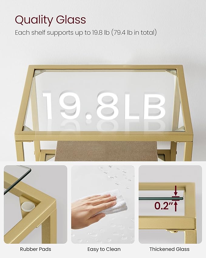 - [Display Your Faves] With transparent glass shelves and a gold-colored frame, this 4-tier shelf boasts stunning modern minimalism. This small shelf allows you to display your greenery, books, and collectibles while elevating the look of your space