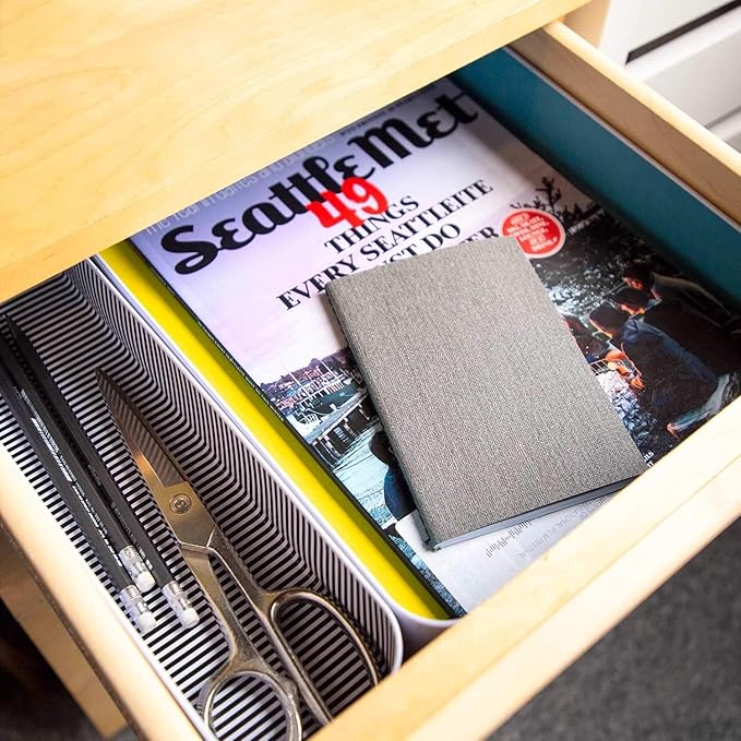 Three by Three Seattle 6 Piece Metal Organizer Tray Set for Storing Makeup, Stationery, Utensils, and More in Office Desk, Kitchen and Bathroom Drawers (2 Inch, Assorted Colors, Stripes)