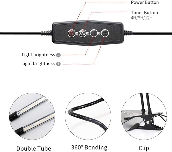 - Easy to Install - with flexible Gooseneck & strong clamp,it allows you to place the growth light in any direction to provide the best lighting angle for your plants,meet the cover around the plant.Powered by USB or AC Power Plug