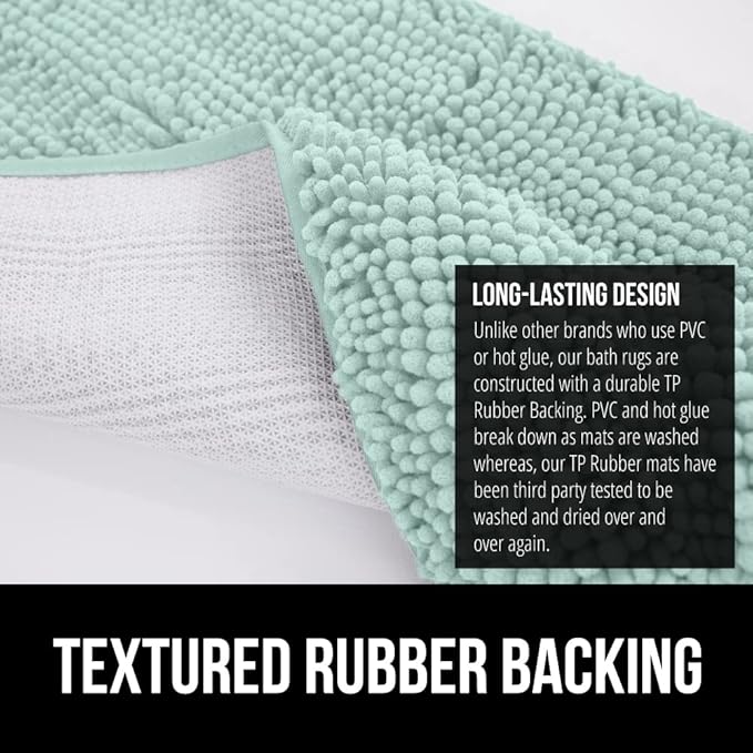 - TEXTURED RUBBER BACKING: unlike other brands who use PVC or hot glue, our bath rugs are constructed with a durable TP Rubber Backing. PVC and hot glue break down as mats are washed whereas, our TP Rubber mats have been third party tested to be washed and dried over and over again for long lasting use
