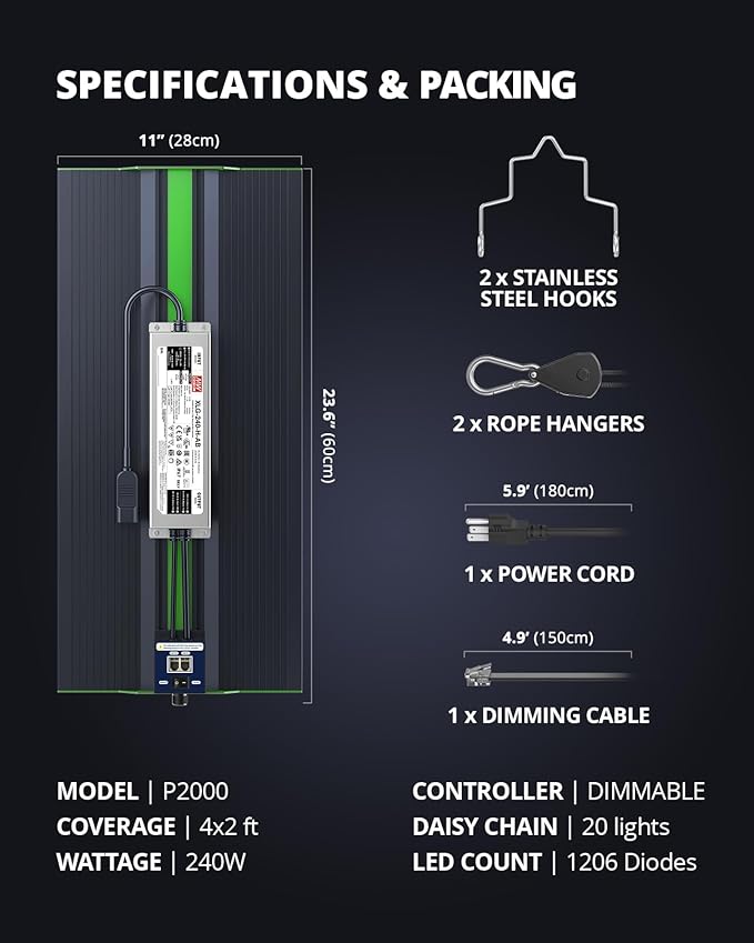 - OPTIMAL FULL SPECTRUM GROW LIGHTS & AMPLE COVERAGE: Consists of 660nm of red light, 3000K and 5000K of the white light spectrum, the P2000 growing lights for seed starting provides plants in all stages from veg to flower with everything they need in the natural sunlight. Perfect for 4'x3' vegetative coverage and 4'x2' flowering coverage. Remember to properly adjust the height and brightness accordingly to your plants desired level for optimal growth.
