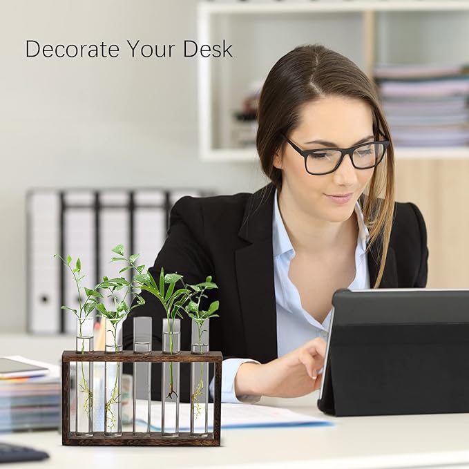 - ❥Scientific plant vase : Perfect combination of natural wood and clear glass, made of natural wood, Unique 5 test tube wooden Plant Stand design. Simple rooting plant cuttings. Smooth surface, good permeability, beautiful shape, best desktop decorative elevate your home office décor and bring a touch of freshness and elegance to your house & office!