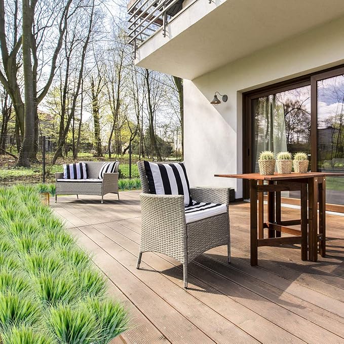 - 【Multifunctional decoration】-designed for outdoor indoors decoration. These lifelike grasses add a charming charm to your front porch, walkway, garden,kitchen, windowsill,living room, dining table, bedroom, terrace and garden fence. Fake grass are very suitable for daily home garden decoration, birthdays, holidays, weddings, memorial places, DIY projects, etc.