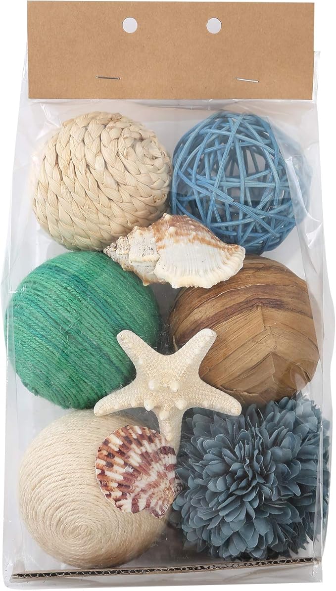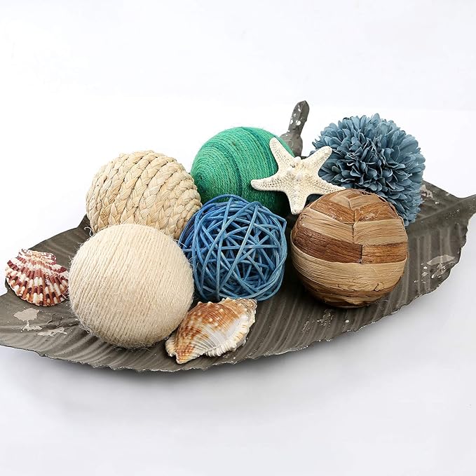 - 2.Package includes: 6pcs decorative balls,3pcs shells,balls.Mixed blue white,assorted rattan wicker balls orb,natural Woven Twig Rattan and unique flower ball .(Not including the black bowl)