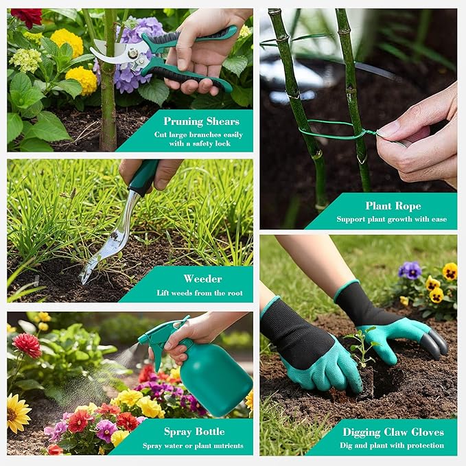 - 11-PIECE ALL-IN-ONE — Large trowel, transplanter, hand rake, cultivator, weeder, pruning shears, pruning snips, 100-ft rope, handheld sprayer, claw gloves, and an Oxford tote—everything to prune, dig, weed, aerate, and plant. Covers your gardening essentials and everyday gardening tools needs in one gardening tool set.