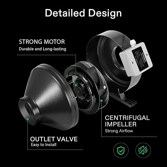 - Effective Ventilation: Heavy hitting blower with a fan speed of 2500 RPM; Puts out only 49 dB noise level; Moves air through your target location efficiently for optimal ventilation; 1050+ RC 48 Australian virgin charcoal bed; The air aluminum ducting features flexible length for exhaust fan blower or inline fan