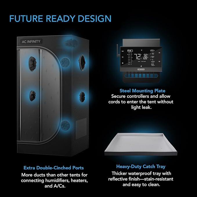 - Innovative controller mounting plate with lightproof cable passthrough and additional duct ports for humidifiers, heaters, and A/Cs.