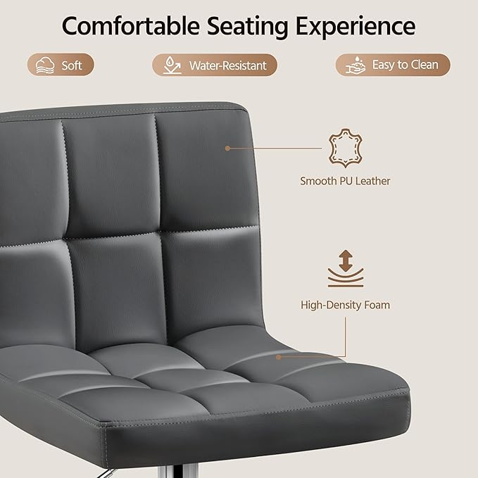 - Extra Cozy: Each part of this swivel bar stool set is about your cozy experience. The 2.8″ thick high-density foam-padded seat and a 14.6″ high backrest are covered by soft PU Leather, having your body well-supported, meanwhile ensuring the seat uneasy to deform