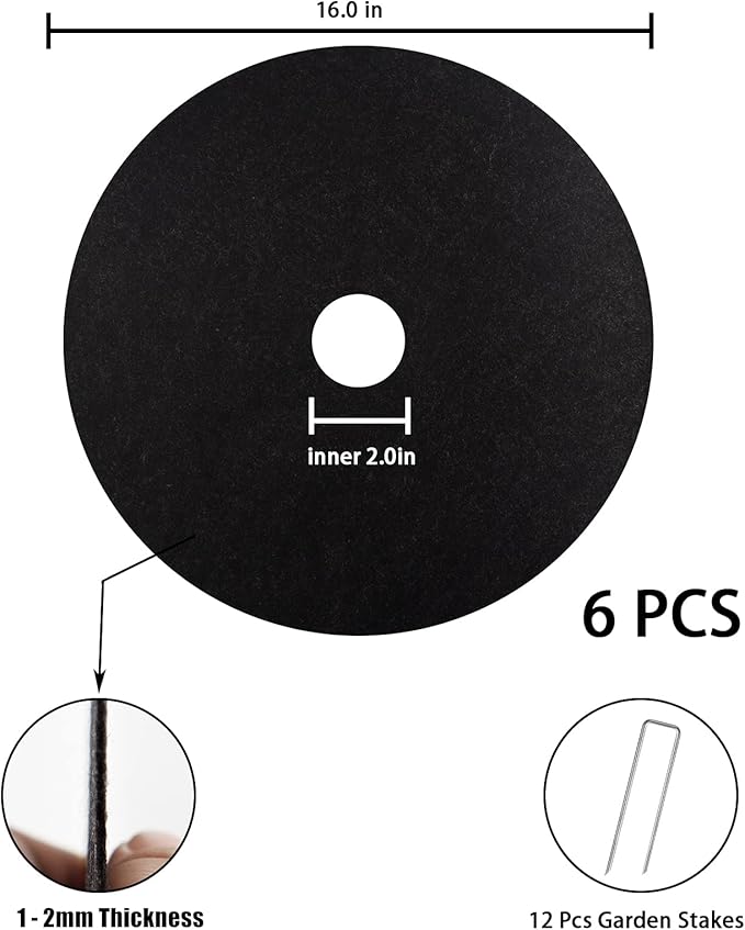 - Package & Size: Package includes 6 pieces tree weed barrier mats, which measure 16 x 0.08 inches and the inner diameter are 2 inches, also comes with 12 pieces garden metal stakes for installation easily