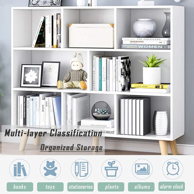 IOTXY Wooden Open Shelf Bookcase - 3-Tier Floor Standing Display Cabinet Rack with Legs, 8 Cubes Bookshelf, Warm White