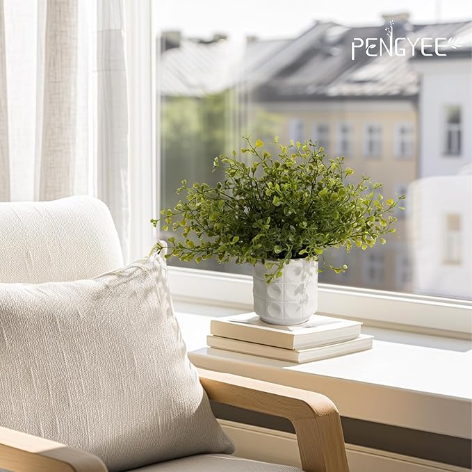 - RUGGED MATERIAL : PENGYEE 4 Pack small fake plants are made of plastic. To make our mini fake desk plants office decor look more realistic, we adopt a unique design to imitate the frosty gray leaves, which is not dirt. Please don't worry about it!