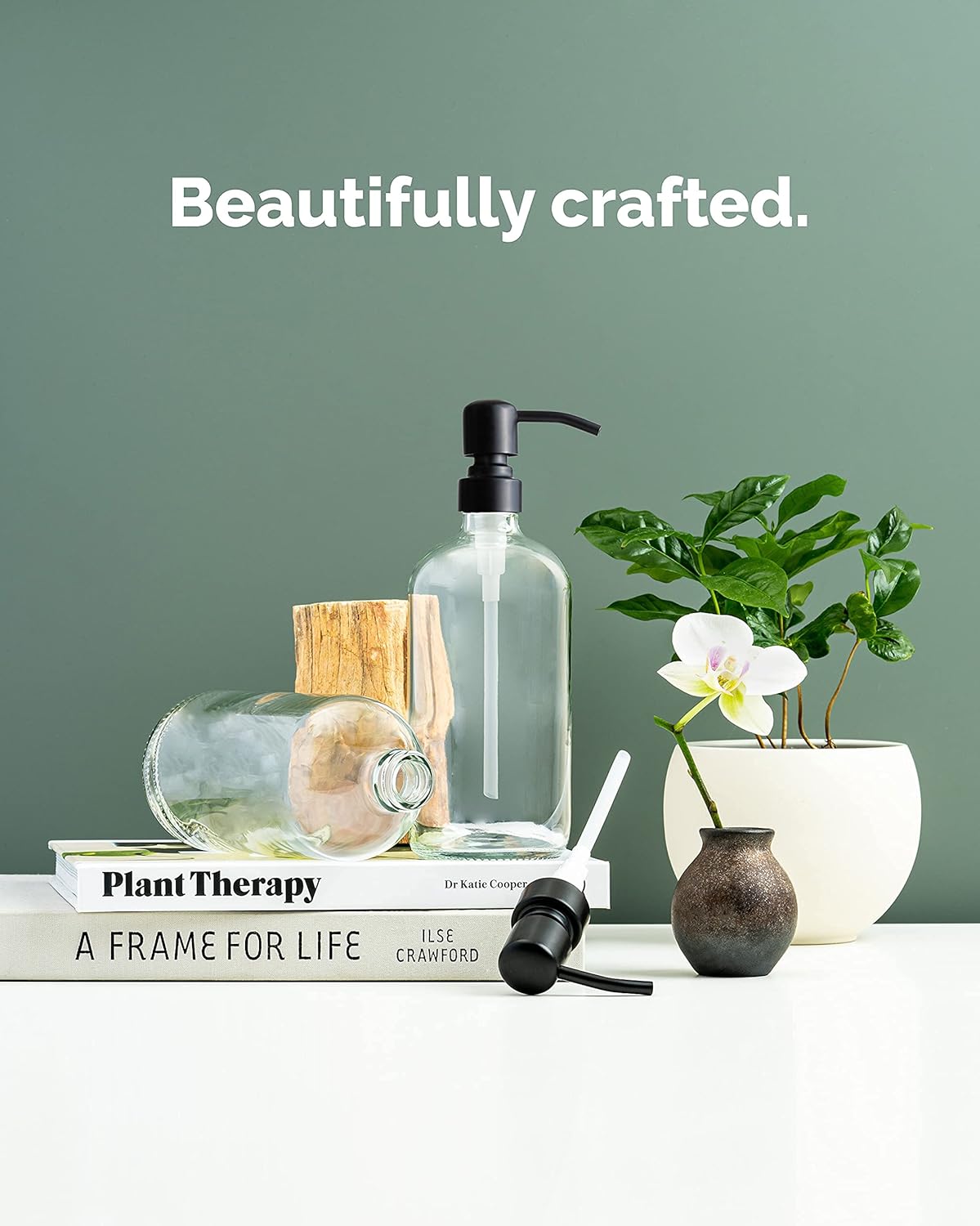 - UNRIVALED CONSTRUCTION - Set of 2 premium fortified glass soap dispenser with pump. 16 Oz shampoo dispenser, bathroom soap dispenser set for daily use. Vine Creations soap dispensers are Lead-free.
