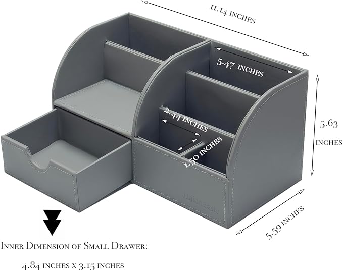- Synthetic Faux Leather and Space Saving: Made of high density board and selected faux leather, with solid interior construction, to withstand the wear and tear of everyday use. Easy to clean, you could quickly wipe them with a damp cloth to remove any dust. At 11.22" wide 5.7" High and 5.7" deep, it fits easily in the desk. Say goodbye to cheap mess desk organizer, invest in this elegant desk organizer that is built to last, keep your workspace organized for years to come