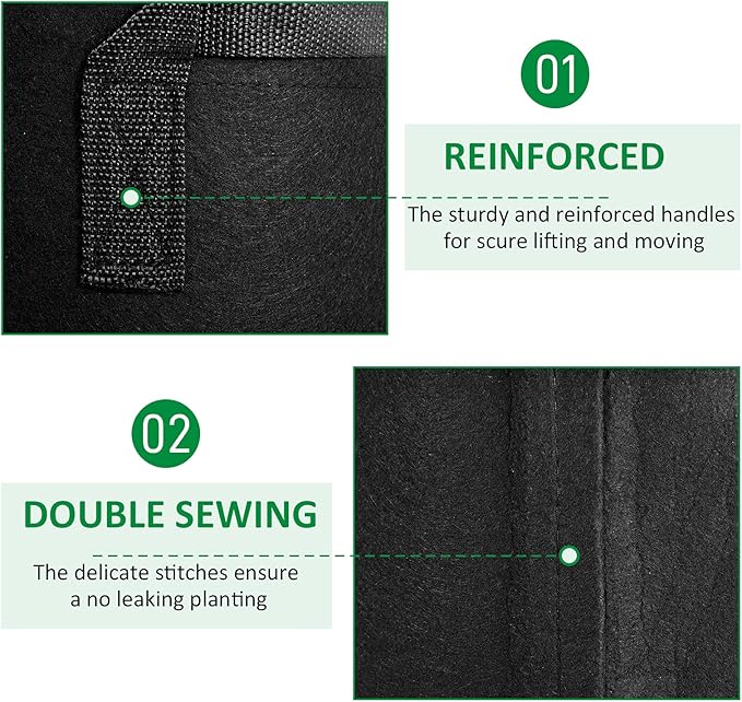 - Handle process: Wide polypropylene ribbon handle, better tension, handle reinforcement lining, easy to move bags filled with soil and plants