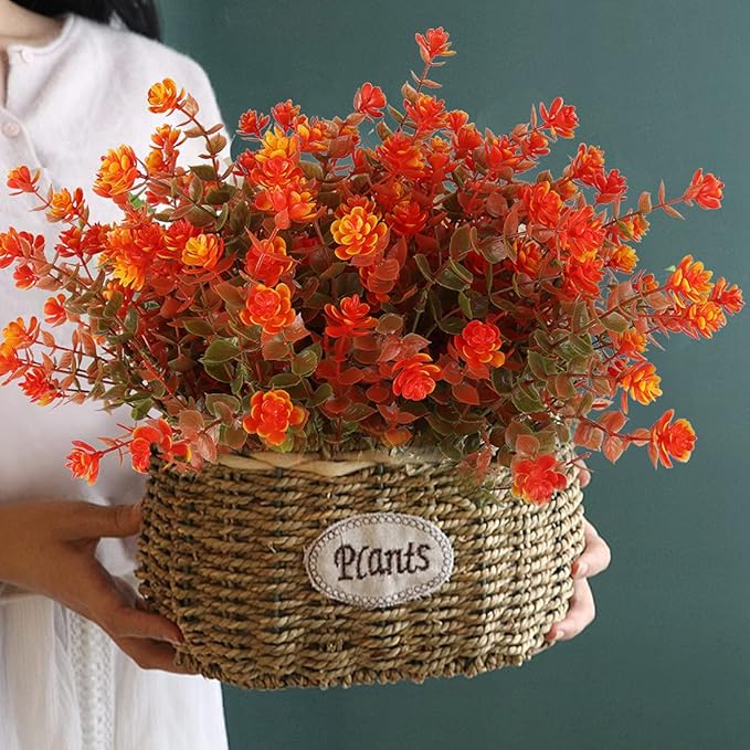 RECUTMS 8 Bundles Artificial Fall Flowers No Fade Faux Autumn Plants, Fake Indoor Outdoor Greenery Decorations for Thanksgiving Christmas Wedding Party Home Garden Fireplace Décor (Green Orange)