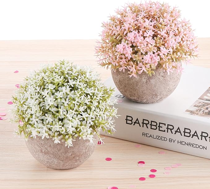 - 【4 Pack Artificial Potted Plants】:4pcs different mini cute plastic plants. Two flower plastic plants ( pink , white) and two faux grass plants ( dark & light green). Each plants measure 13 x 13cm/5 x 5’’, very cute and small, perfect for small spaces.