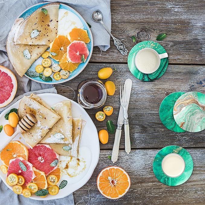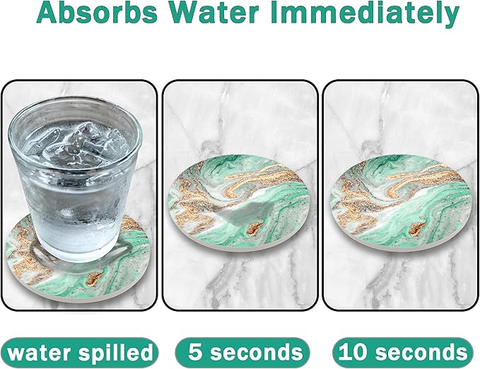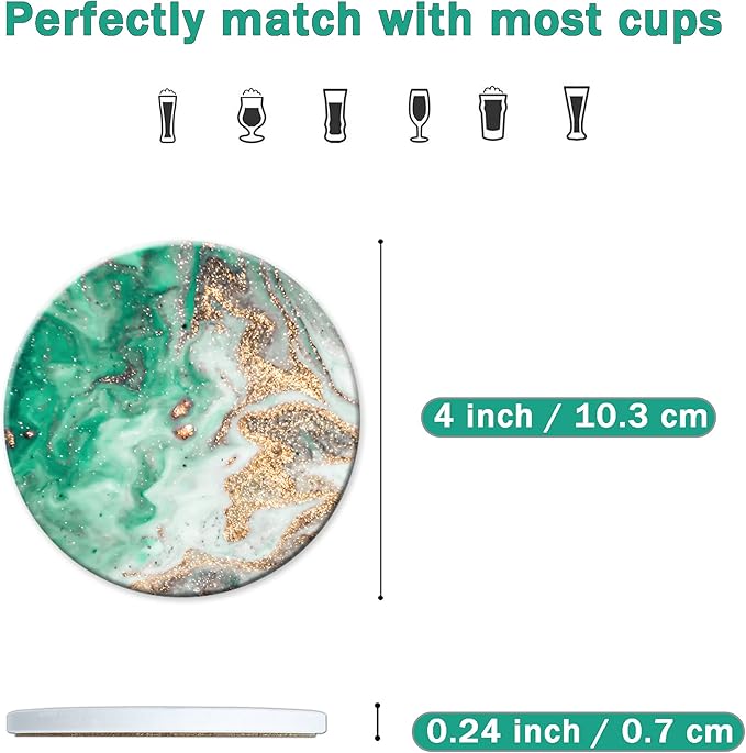 Dooke Coasters for Drinks,Round Absorbent Ceramic Stone Coasters Set of 6 with Cork Base,Funny Drink Coasters with Holder for Cold Drinks Wine Cups Tabletop Protection,4 Inches,Turquoise Green Marble