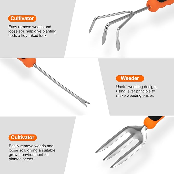 - 【Sturdy and Stainless Steel Garden Set】: Each tool has an ergonomically made soft handle, fashioned from high-quality TRP, that fits comfortably in small and large hands, on top of that, they’re intuitively designed to provide plenty of leverage and save you effort and strain when planting, weeding, and digging. Precisely scaled stainless steel blades that remain sharp for cutting. Sawtooth shovel for easy digging, 2.0 mm thickness, ensuring perfect insertion into the soil.