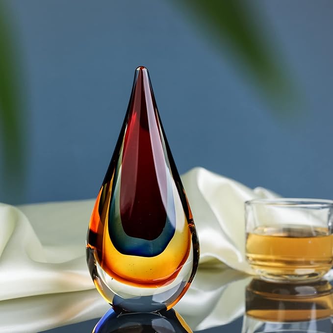 - [Design Features] Art glass sculpture is designed with teardrop, uses brilliant colors, red, blue, yellow, transparent, four-color gradients, and is shaped like a waterdrop. It has rich contemporary home features