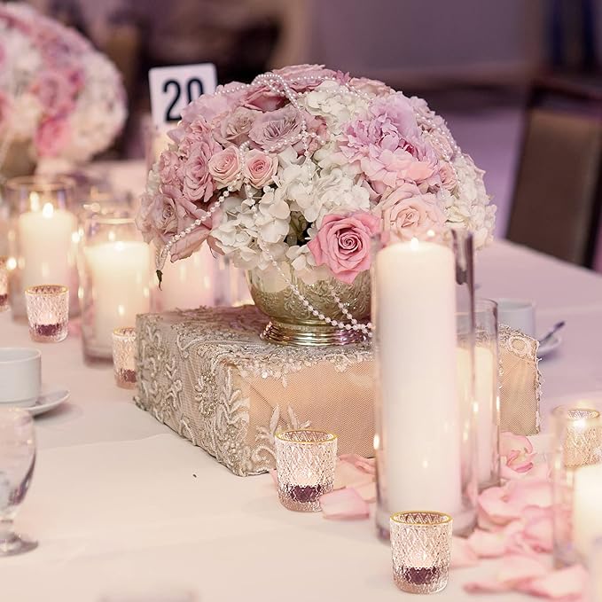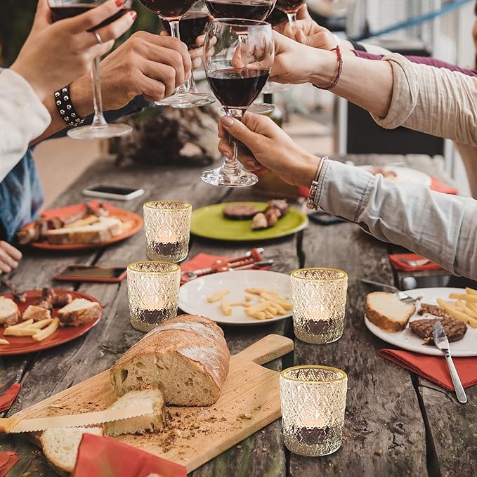 - Gold Rim Glass Candle Holder: 12 pcs clear glass candle holders set with elegant rim. The studded knobby glass let the light being scattered, making them much more interesting than simple votive candle holders