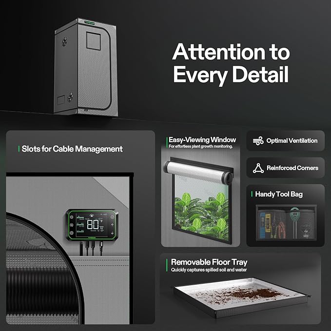 - Observation Window + Removable Floor Tray: Our easy-access observation window makes it easy to observe your plants; The detachable floor tray captures any spilled soil and keeps the tent clean