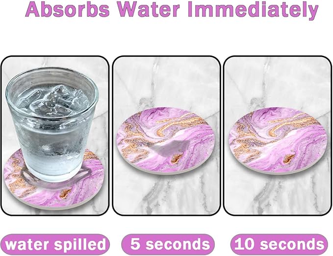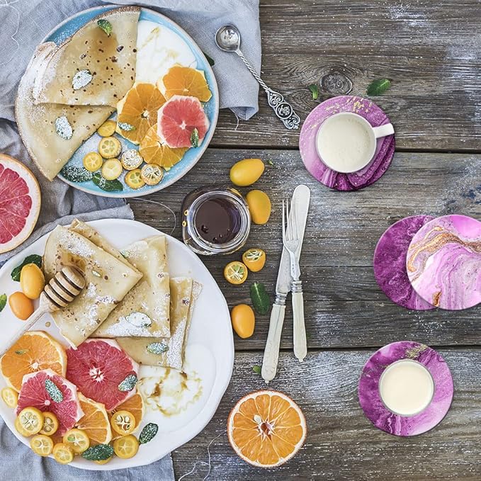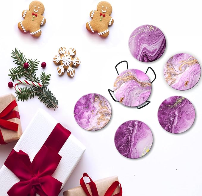 Dooke Coasters for Drinks, Round Absorbent Ceramic Stone Coasters Set of 6 with Cork Base, Funny Drink Coasters with Holder for Cold Drinks Wine Mugs and Cups Tabletop Protection, 4 Inches,Purple
