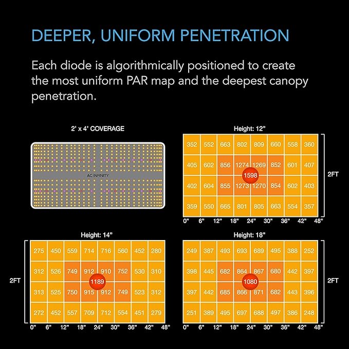 - Algorithmically positioned diodes create the most uniform PAR map and the deepest canopy penetration.