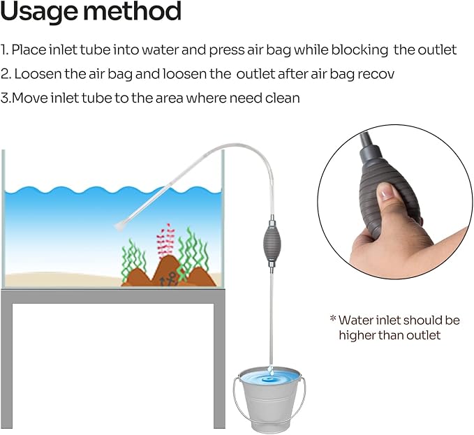 - 【2 IN 1 Multifunctional Siphon Gravel Cleaner Set】: It can work as water changer or tank cleaner as it has grid inlet head and oblate head, you can install the head as you need. Whether you have a small or extra-large tank, this flexible terrarium cleaning kit works well with all types of terrarium, the tube is long enough(79inch) and flexible, convenient to use.