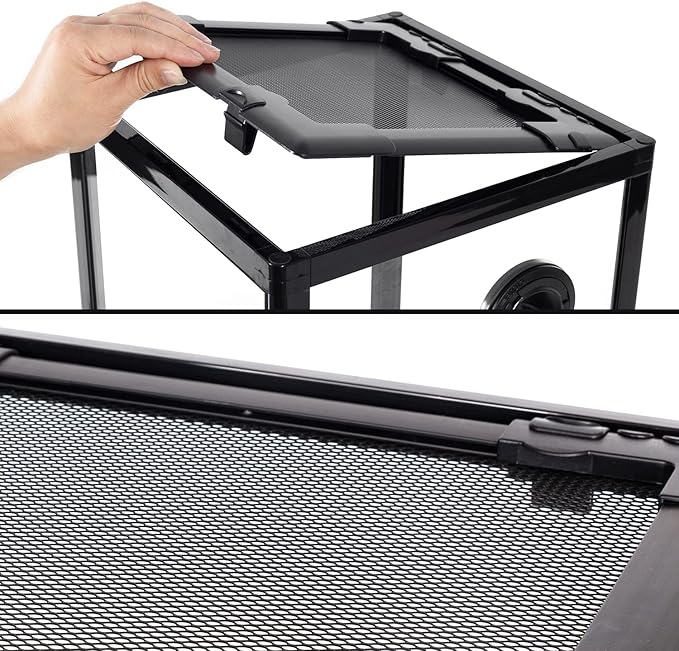 - 【Removable Top Mesh Screen】: Removable top mesh screen provide plenty of proper air-flow and allows full spectrum, UVB and IR light penetration. On top and side have closable inlets for wires and tubing. All sides are glass(except the mesh top cover), it will give your pet a warm room