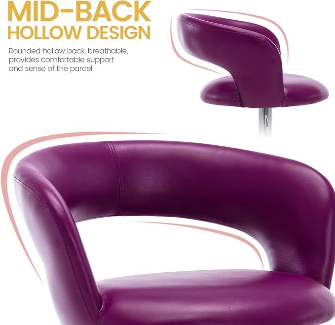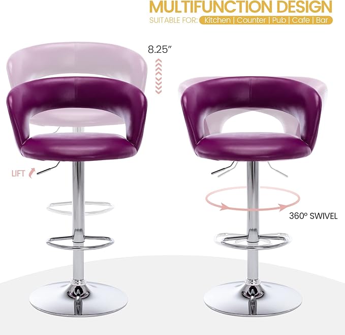 Brage Living Wide Bar Stool, Modern PU Leather Swivel Adjustable Barstool with Hollow Back and Arms, Upholstered Airlift Counter Height Bar Chair for Kitchen Dining (Purple)