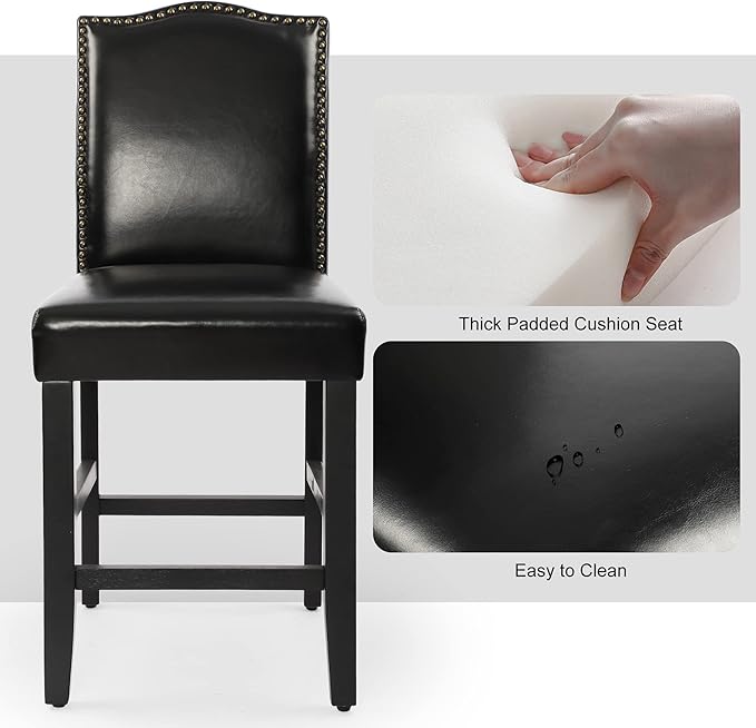 LSSPAID Counter Height Bar Stools Set of 2, 23.5 Inch Pu Upholstered Barstools, Kitchen Island Chairs with Bronze Nail Backrest and Solid Wood Legs for Kitchen Pub Home Cafe, Black