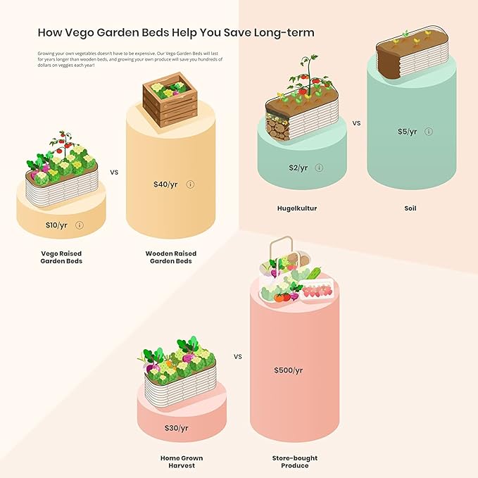 - Sustainability: Here at Vego Garden, sustainability is at the core of everything we do. We want to be as transparent as possible about the ways we are working towards our sustainability goals. By choosing to build your garden beds with recyclable, long lasting metal, by using Hügelkultur gardening method to increase the amount of waste converted by making composting, you can create an ideal ecosystem within the bed for your plants to thrive. With your help, we can grow a greener future