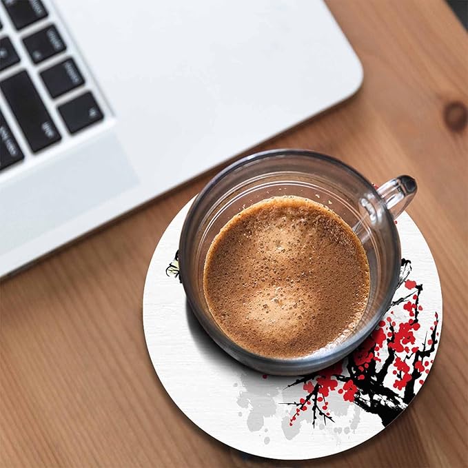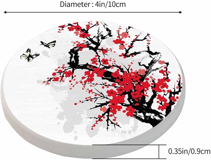 Cherry Branch Drink Coasters Modern Foliage Butterfly China Classic Blossoming Oriental Ink Culture Housewarming Presentss for New Home Present for Friends,2 Pcs,4 X 4 X 0.35 Inches
