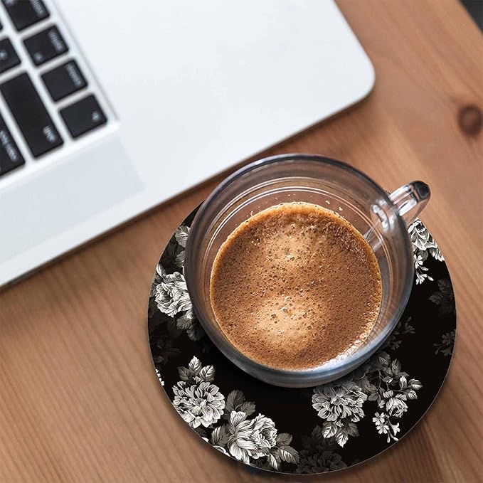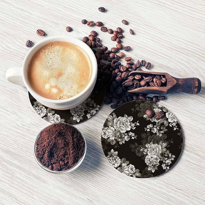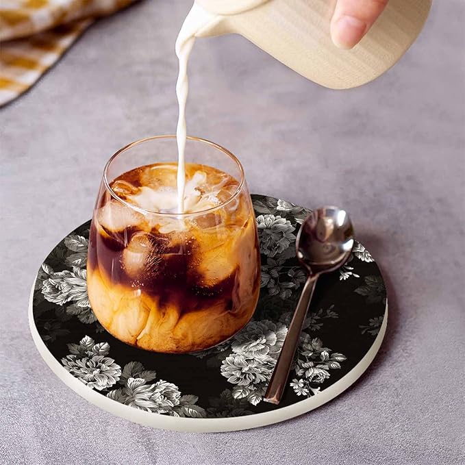 Watercolor Black Flowers Cup Coasters Set of 2 Elegance Botanical Flower Pattern Grey Rose Bouquet Wooden Table Apartment Decor 100% Diatomite for Drinking Glasses,4 Inches
